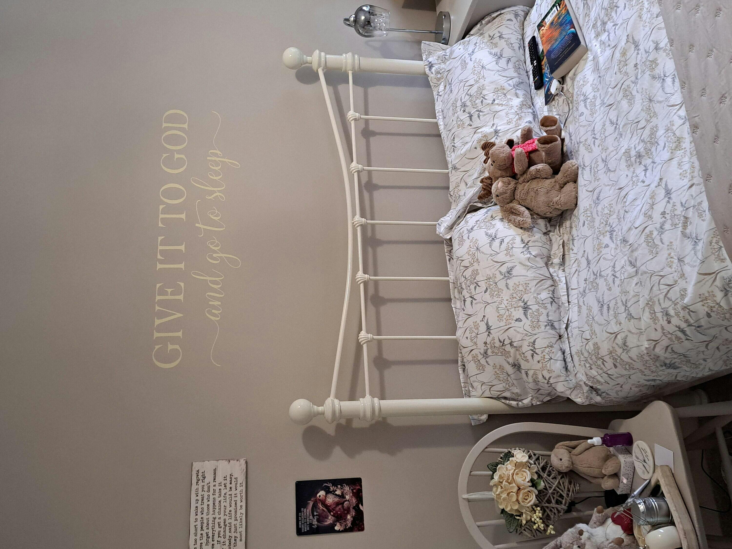 A beautiful reminder to release your worries, trust in faith, and rest peacefully. This elegant decal is perfect for bedrooms, prayer rooms, or any space where you seek calm and encouragement.